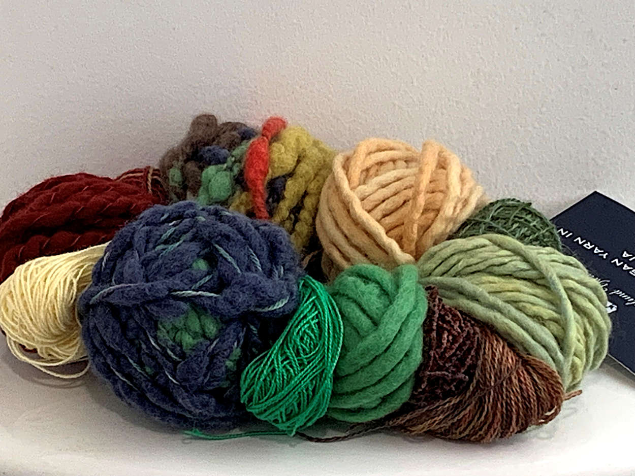 Our left over yarn from our hand spinning, weaving projects, dyeing trials and from underweight ends are wound into small balls and tied together.  As these gorgeous ends are formed from rescued yarn each bundle is different.  Our cute Florettes are a great way to collect yarns in particular colour ways or add special effects to your projects.