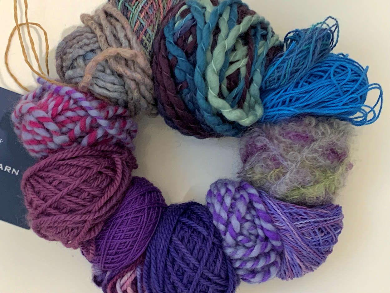 Gorgeous collection of yarn mill ends tied together in a combination of blues and purples with splashes of pink, green, teal, blue and brown.