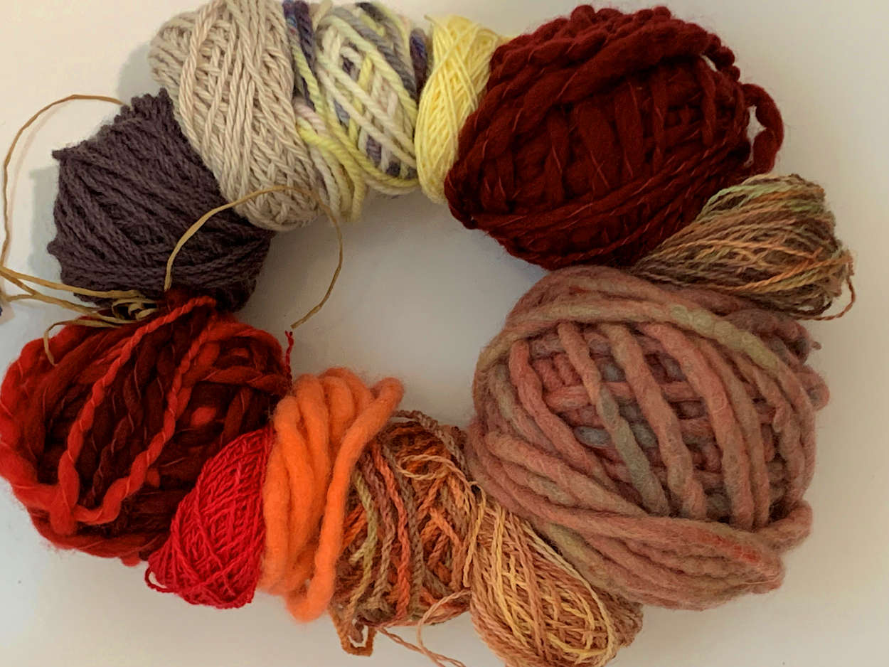 Gorgeous collection of yarn mill ends tied together in a combination of red, burgundy, orange, peach, grey and lemon with splashes of brown and green.