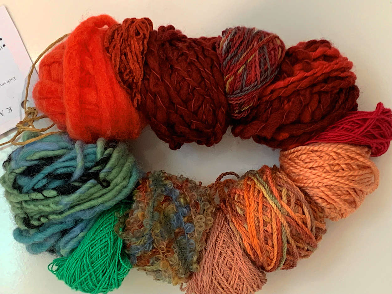 Gorgeous collection of yarn mill ends tied together in a combination of red, burgundy, peach, green, teal and brown with splashes of mustard, grey and blue.